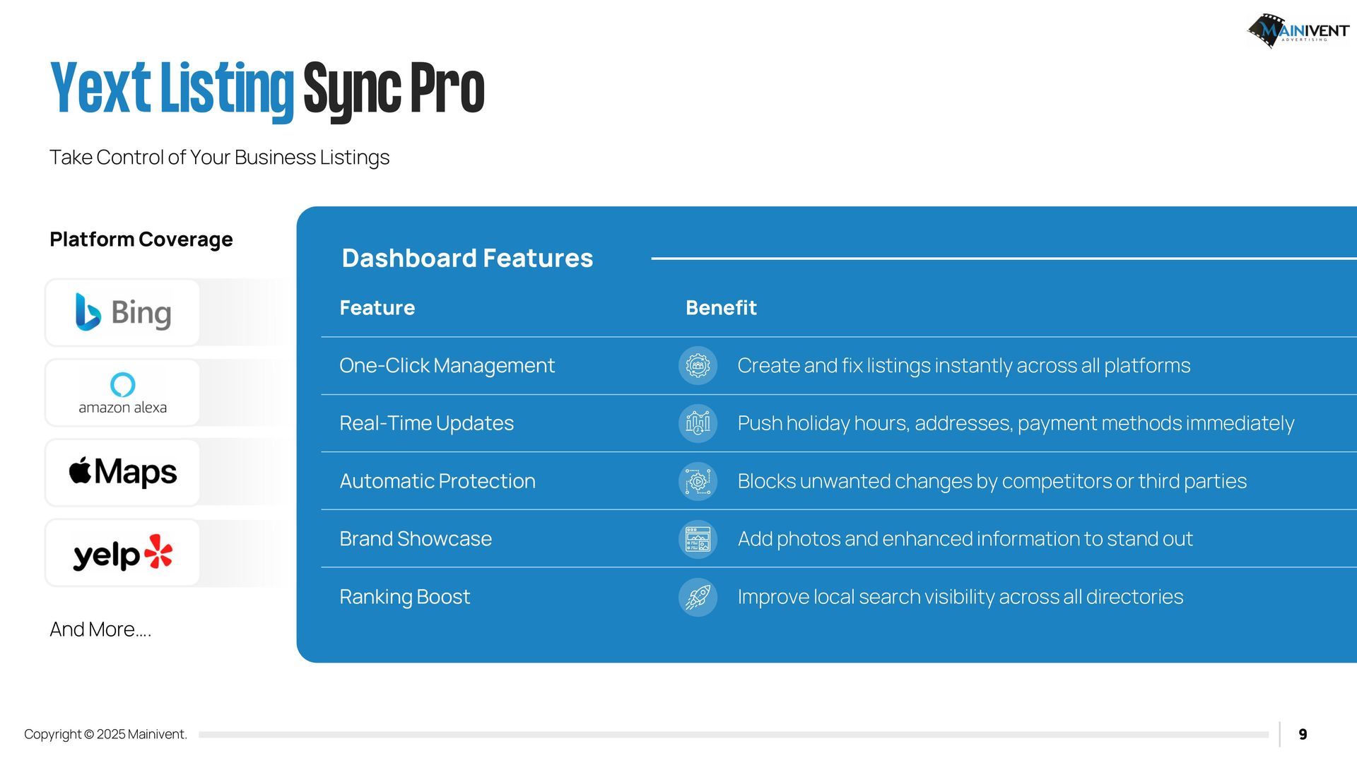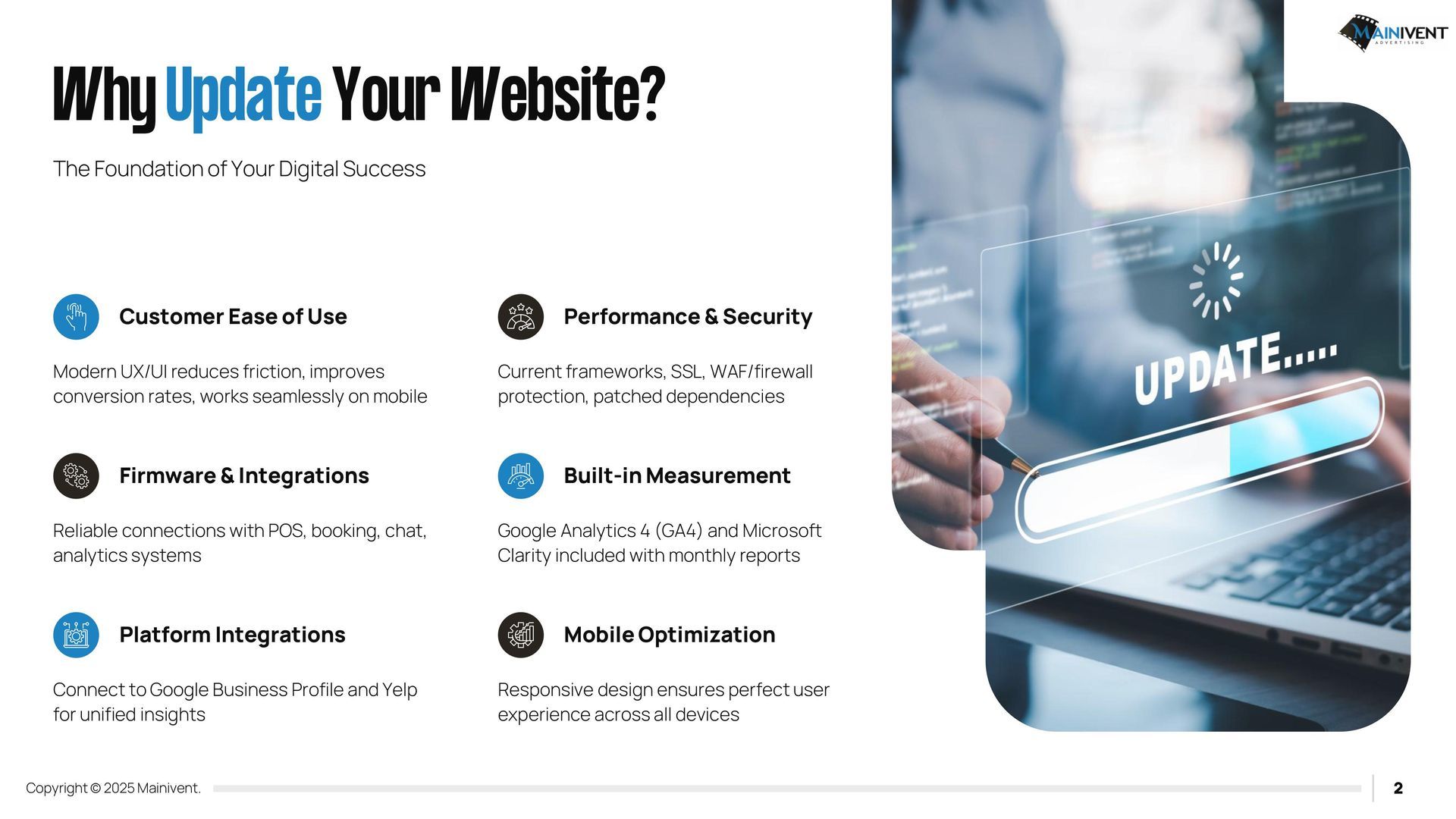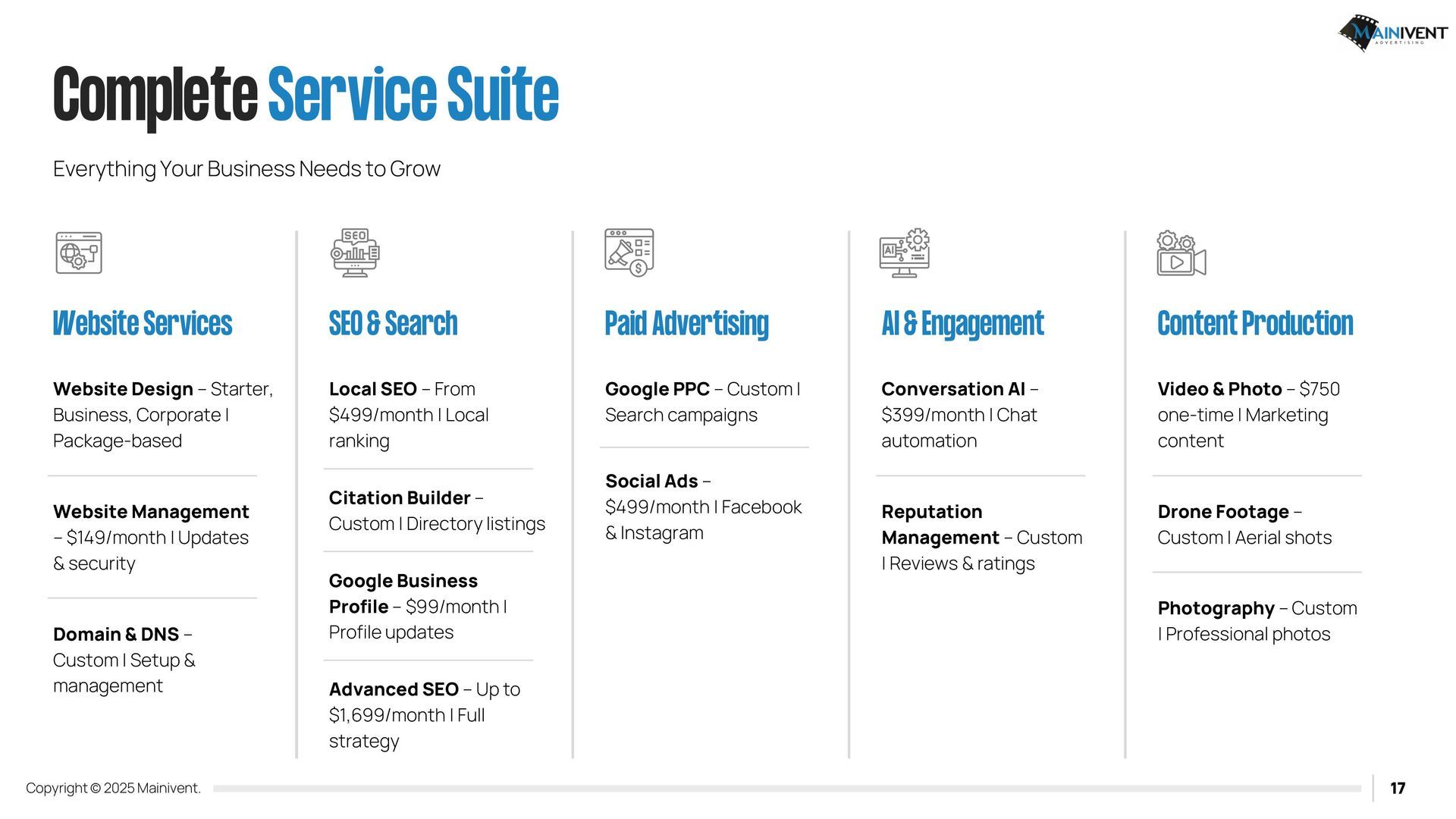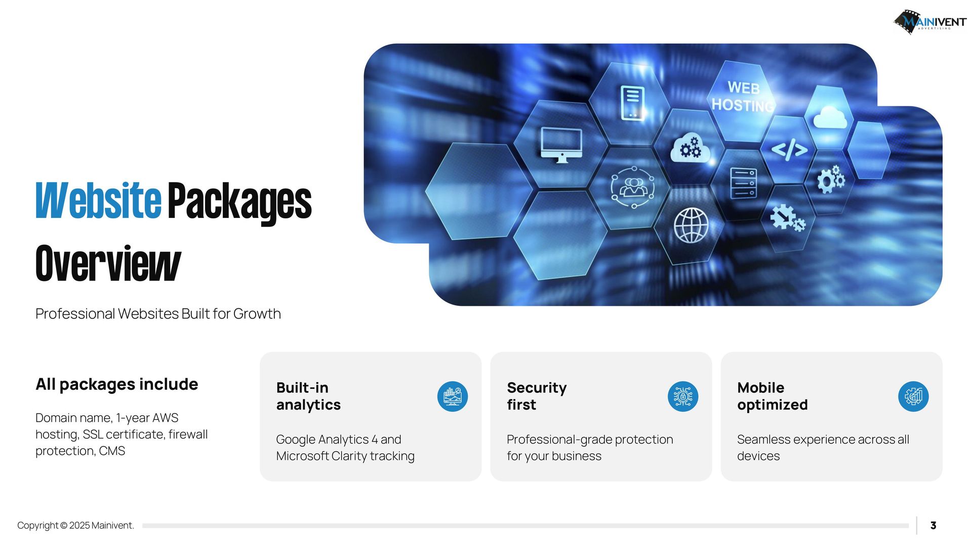 Mainivent Advertising Agency is a full-service website advertising company. We will provide you with a Username and Password so that you can edit and have your website forever. If you have chosen one of the packages, it will include our services to update your website monthly. We will need access to your Domain provider if you wish to use an existing URL, if you do not, we can purchase a new one for your business. These packages require (2) plug ins. IDX Broker and Realty Candy.