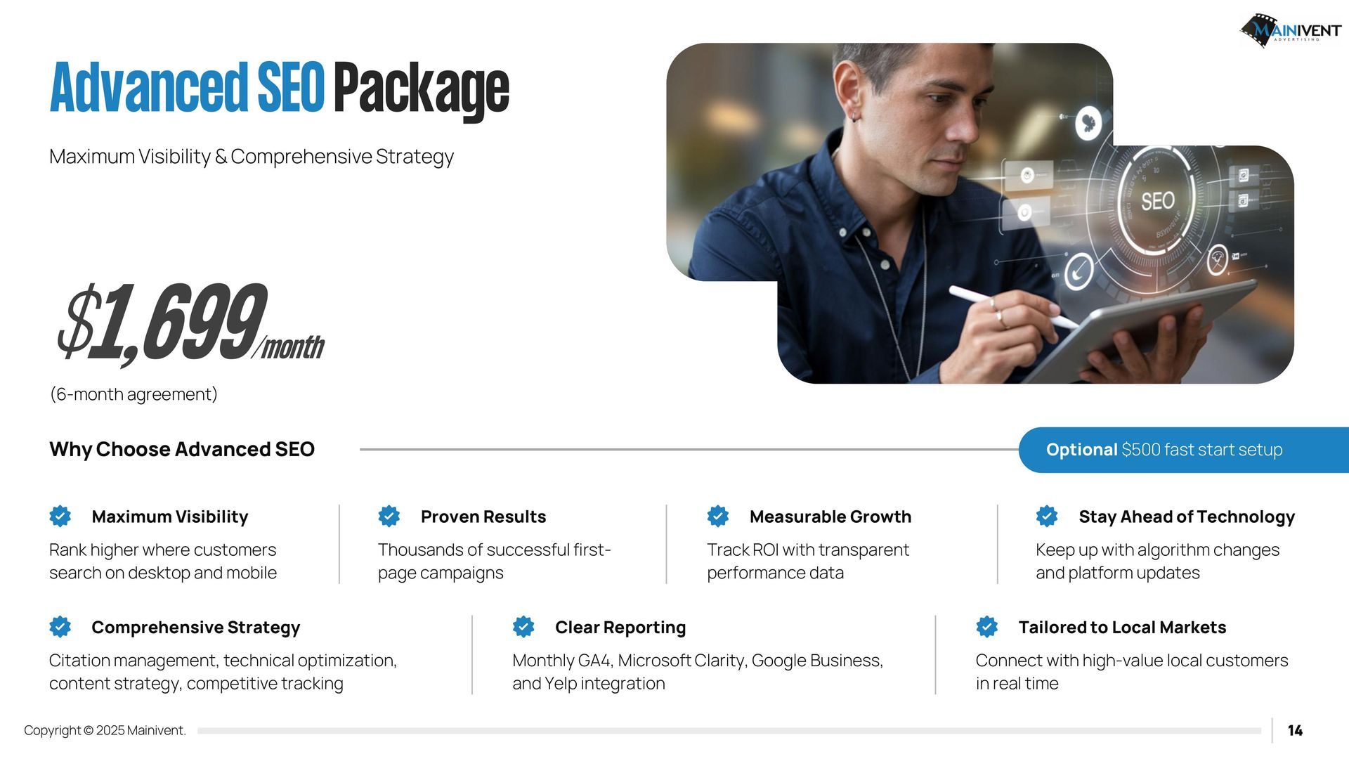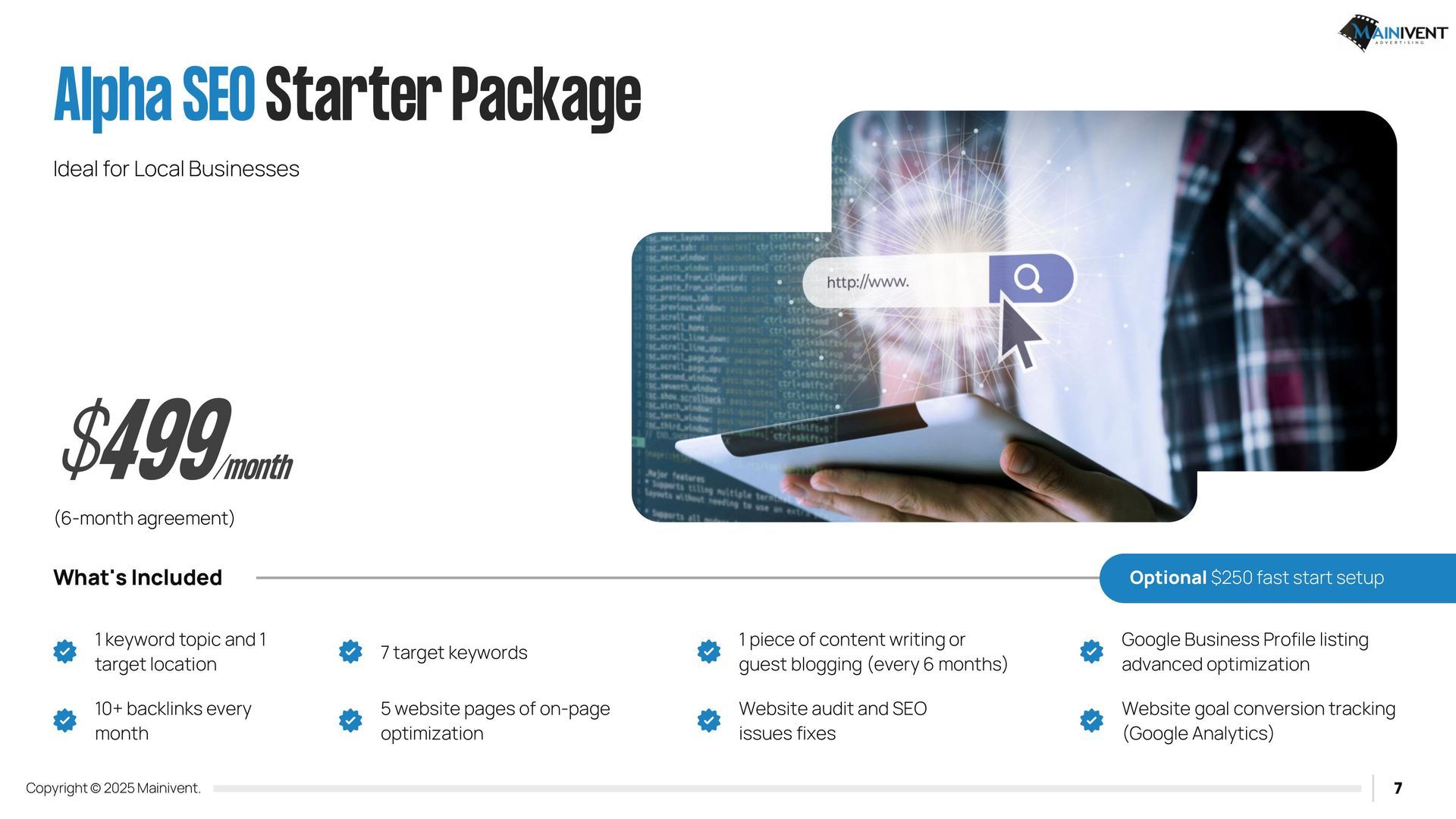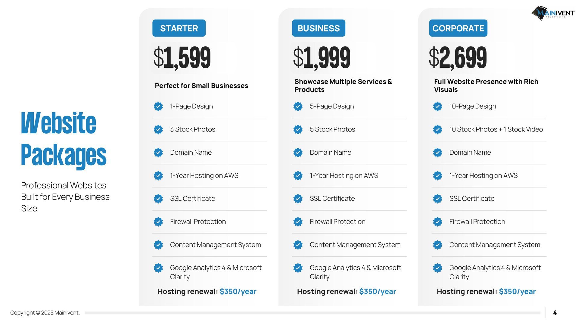 All packages come with Google Search Console Installed, Google G4 Analytics and monthly reporting. Also includes Graphic Design for updated monthly specials. Yearly AWS Hosting $280 per year after 1st year. *Customer responsible for monthly, set up and yearly renewal.